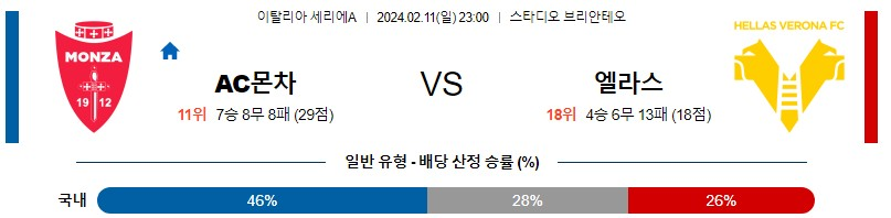 [킹콩티비] 몬차 엘라스베로나 분석 2월11일 세리에A 스포츠중계