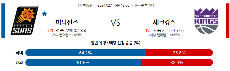 [킹콩티비] 피닉스 새크라멘토 분석 2월14일 NBA 스포츠중계