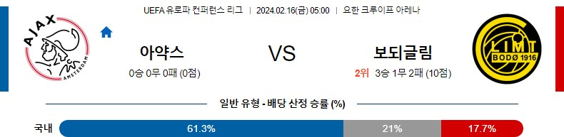 [킹콩티비] 아약스 보되 분석 2월16일 유로파컨퍼런스 스포츠중계