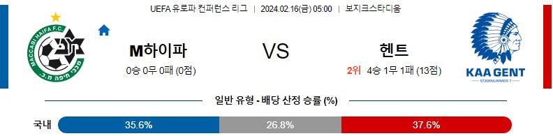[킹콩티비] 마키비하이파 헨트 분석 2월16일 유로파컨퍼런스 스포츠중계