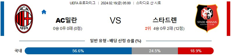 [킹콩티비] 밀란 스타드렌 분석 2월16일 유로파 스포츠중계