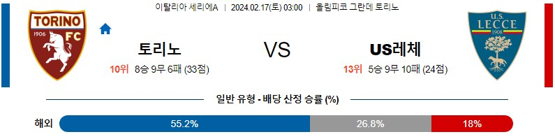 [킹콩티비] 토리노 레체 분석 2월17일 세리에A 스포츠중계