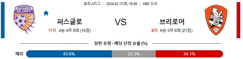 오버(3.5) 양상에서 퍼스글로리가 승리를 기록할 것으로 본다. 홈에서의 강세도 무시하기는 어려울 것으로 보이는 상태이고, 특히 화력전에서의 장점을 양껏 보여주고 있다는 점을 중요하게 생각할 수 있을 것. 브리즈번이 늘 원정에서는 약한 편이고, 특히 네빌이 없으면 기초적인 실수가 너무 잦아지는 상황도 잦다.
