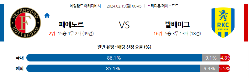 [킹콩티비] 페예노르트 발베이크 분석 2월19일 에레디비시 스포츠중계