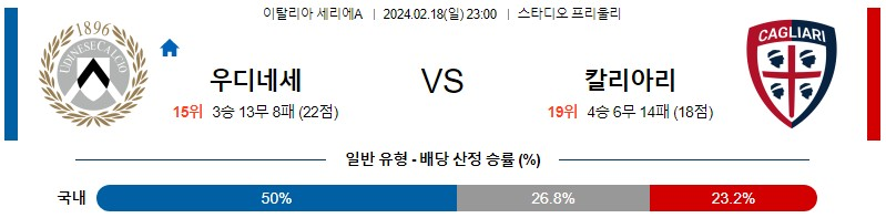 [킹콩티비] 우디네세 칼리아리 분석 2월18일 세리에A 스포츠중계