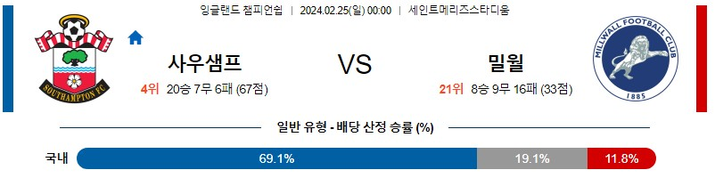[킹콩티비] 사우스햄튼 밀월 분석 2월25일 챔피언쉽 스포츠중계