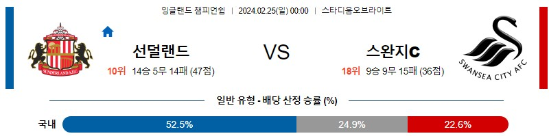 [킹콩티비] 선덜랜드 스완지시티 분석 2월25일 챔피언쉽 스포츠중계