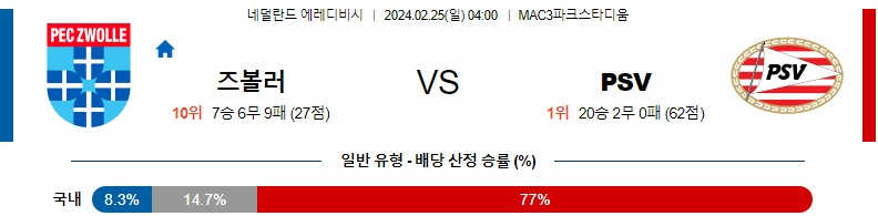 [킹콩티비] 즈볼러 에인트호번 분석 2월25일 에레디비시 스포츠중계