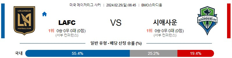 시애틀의 수비를 로스엔젤레스도 명확하게 뚫어내는 모습은 보여주지 못하고 있다. 언더(2.5) 양상을 기대할 것. 다만 소유권을 차지하려는 시도 자체가 적어서 시애틀이 로스엔젤레스의 전진을 허용하는 경우는 매우 잦은 편이고, 이 때문에 로스엔젤레스가 결국 뚫릴때까지 공격을 시도하는 것으로 실마리는 잡아내는 분위기다.