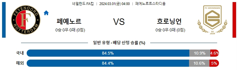 [킹콩티비] 페예노르트 FC흐로닝언 분석 3월1일 네덜란드FA컵 스포츠중계