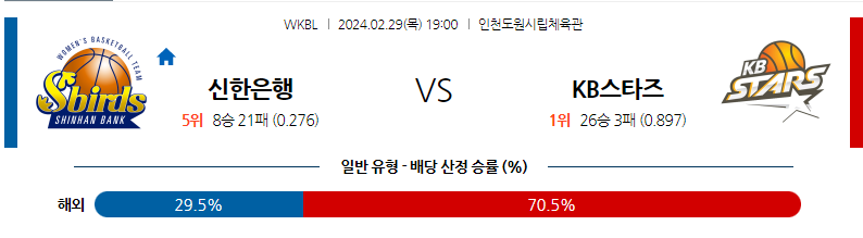 KB스타즈는 직전경기(2/24) 홈에서 삼성생명 상대로 84-52 승리를 기록했으며 이전경기(2/19) 원정에서 우리은행 상대로 58-80 패배를 기록했다.