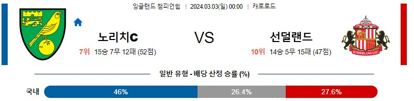 [킹콩티비] 노리치시티 선덜랜드 분석 3월3일 챔피언십 스포츠중계
