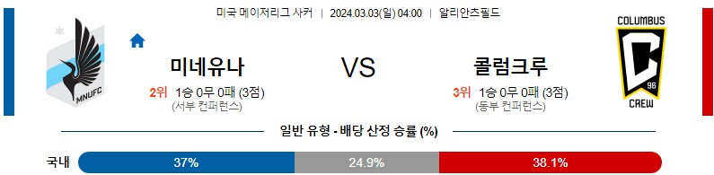 미네소타가 할만한 상황이 될 것으로 보인다. 콜럼버스의 수비력이 홈에서만 안정적으로 굴러가는 상황이 잦다는 점이 있는 편이고, 이 때문에 콜럼버스도 미네소타 홈에서는 상당히 고전하는 편. 물론 결정력이라는 면에서 미네소타도 아직 명확한 모습은 아니다. 핸디캡을 거는 것도 좋은 선택이 될 것.