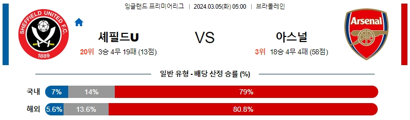 [킹콩티비] 셰필드 아스날 분석 3월5일 프리미어리그 스포츠중계