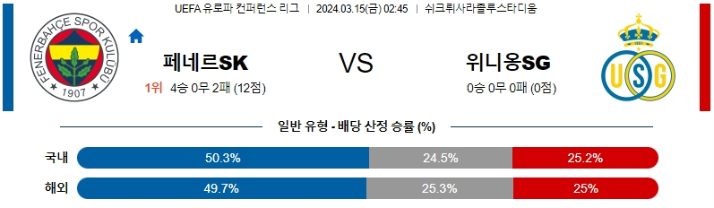 [킹콩티비] 페네르바흐체 위니옹 분석 3월15일 컨퍼런스리그 스포츠중계