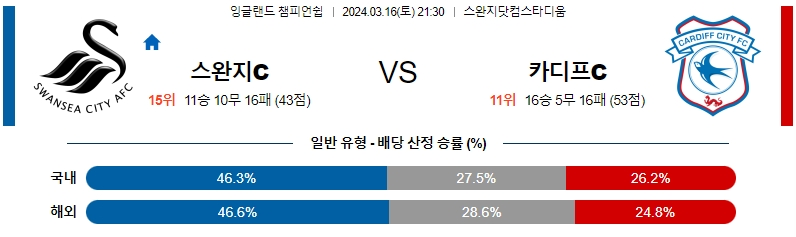 [킹콩티비] 스완지시티 카디프시티 분석 3월16일 챔피언쉽 스포츠중계