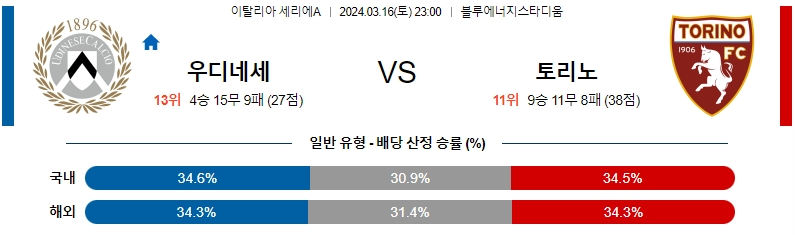 [킹콩티비] 우디네세칼초 토리노FC 분석 3월16일 세리에A 스포츠중계