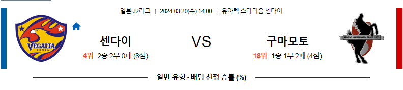 센다이가 승리를 거둘 것으로 본다. 확실히 올 시즌 수비력에서는 상당히 괜찮은 퍼포먼스를 보여주는 것이 사실. 공격력이 크게 두각을 드러내는 상황은 아니지만, 구마모토가 결국 전방에 힘을 꽉 주는 것이 수비적으로 무너지는 것으로 이어지고 있다는 점을 생각해야 할 것.
