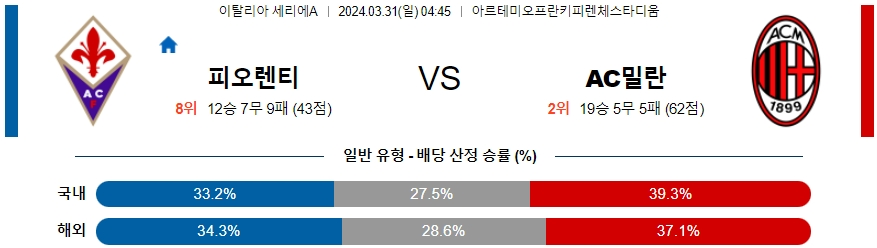 [킹콩티비] 피오렌티나 AC밀란 분석 3월31일 세리에A 스포츠중계