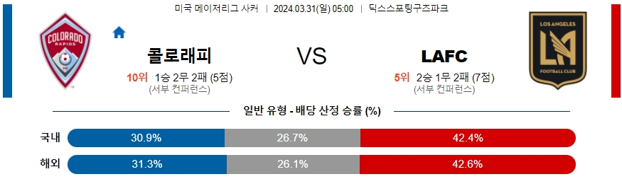 언더(2.5) 양상에서 로스엔젤레스가 이기는 것을 기대하고 있는 매치다. 로스엔젤레스가 기복이 있기는 해도, 빠른 속도라는 장점의 잠재력은 있는 팀. 소극적으로 보일 정도로 느린 콜로라도인데, 로스엔젤레스가 가지고 있는 기동력과 경쟁하기에는 어려울 것으로 보고 있다.