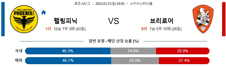 웰링턴이 매우 유리한 매치가 될 것으로 보고 있다. 결국 수비 상황에서 브리즈번이 네빌이 없는 상황에서는 신뢰를 보내기 어렵다는 점을 생각해야 할 것. 수비가 강한 웰링턴이 굳이 다득점을 기록하지 않는다고 하더라도, 승리를 가져오는 데 문제를 크게 일으키는 모습은 아니다.