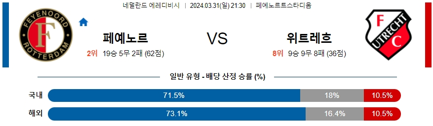 [킹콩티비] 페예노르트 위트레흐트 분석 3월31일 에레디비시 스포츠중계