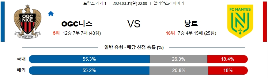 [킹콩티비] 니스 낭트 분석 3월31일 리그1 스포츠중계
