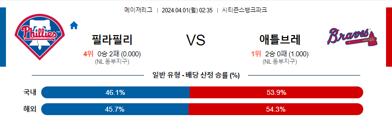 [킹콩티비] 필라델피아 애틀랜타 분석 4월1일 MLB 스포츠중계