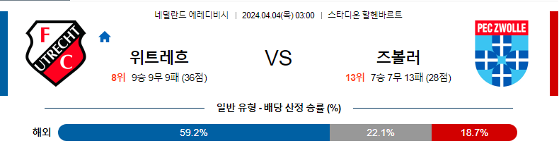 [킹콩티비] 위트레흐트 즈볼러 분석 4월4일 에레디비시 스포츠중계