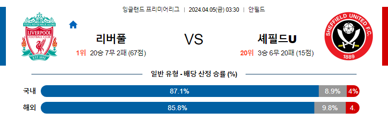 리버풀이 이기는 것 이외의 결과는 사고다. 다만 리버풀이 은근히 셰필드를 상대로는 대량 득점을 성공시키지 못했다는 점, 최근 셰필드의 공격적인 성과가 나쁘지는 않다는 점을 생각해야 할 것. 리버풀의 공격진 페이스나 결정력도 100%는 아니다. 스코어 차이가 생각보다는 크지 않을 가능성을 염두에 두는 것이 좋을 듯.