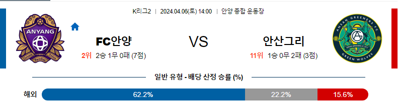 안양이 우세할 것으로 보고 있는 매치다. 일단 안산이 공격적인 플레이를 유지하는 상황에서는 침투를 중시하는 안양이 상당히 유리하게 갈 것임을 직감할 수 있을 것. 실제로 안양이 안산을 상대로 그동안 상성이 좋아 보이기도 했던 상태. 안양 외국인 선수의 폼과, 전반적인 밸런스도 합격점을 줄 수 있다.