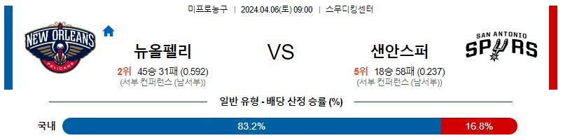 뉴올리언즈는 브랜든 잉그램, 호세 알바라도가 없고 자이언 윌리엄슨의 출전 여부가 불투명하다. 핸디캡 승부에서 샌안토니오가 밀리지 않을 것이다.