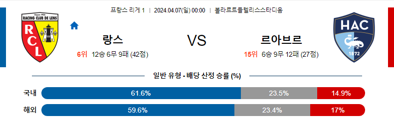 언더(2.5) 양상에서 랑스가 신승하는 것을 기대해보는 매치다. 일단 랑스가 하위권 팀을 상대로는 압박을 매개로, 승부를 유리하게 가져가는 편이다. 그나마 르아브르가 웅크리는 상황에서 버티는 능력이 매우 뛰어난 편임을 생각해야 하는 상황. 니스나 브레스트를 상대로도 어쨌든 실점을 제어하는 모습은 보여준 바 있다.