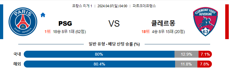 [킹콩티비] 파리생제르맹 클레르몽 분석 4월7일 리그1 스포츠중계