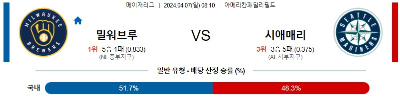 [킹콩티비] 밀워키 시애틀 분석 4월7일 MLB 스포츠중계