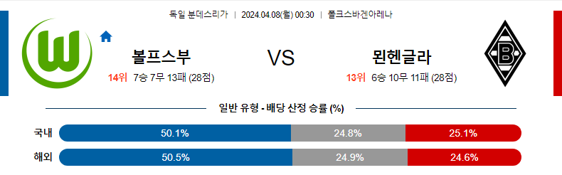 [킹콩티비] 볼프스부르크 묀헨글라트바흐 분석 4월8일 분데스리가 스포츠중계