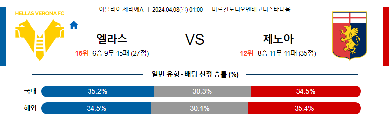 [킹콩티비] 엘라스베로나 제노아 분석 4월8일 세리에A 스포츠중계