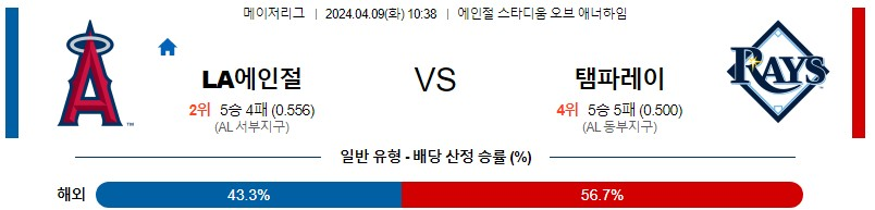 [킹콩티비] 에인절스 템파베이 분석 4월9일 MLB 스포츠중계
