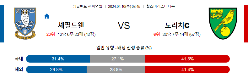 [킹콩티비] 셰필드웬즈데이 노리치 분석 4월10일 챔피언쉽 스포츠중계