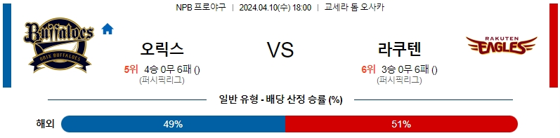 [킹콩티비] 04월 10일 오릭스 vs 라쿠텐 NPB 생중계, 스포츠분석,스포츠중계