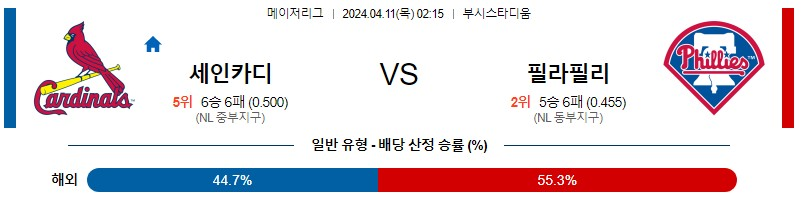 [킹콩티비] 04월 11일 세인트루이스 vs 필라델피아 MLB 생중계, 스포츠분석,스포츠중계
