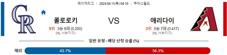 [킹콩티비] 04월 11일 콜로라도 vs 애리조나 MLB 생중계, 스포츠분석,스포츠중계