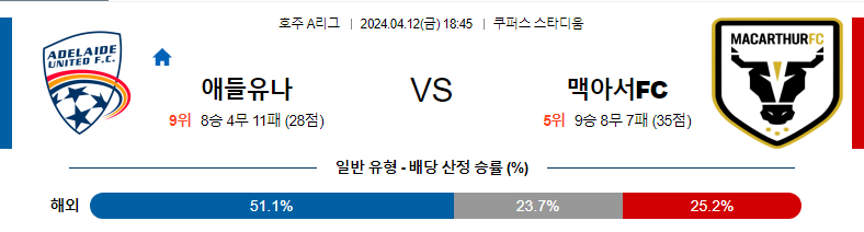 맥아서가 괜찮은 양상으로 갈 수도 있을 듯 하다. 맥아서가 라인을 내리고 역습 성향으로 가는 상황에서의 결과가 전반적으로 더 좋은 편이라는 점이 포인트. 애들레이드의 최근 득점력이야 높은 평가를 해줄 수 있다고 하더라도, 덩달아 높아지는 실점률과 함께 이부스키의 활약상이 얼마나 지속될 상황인지 모른다는 변수도 있다.