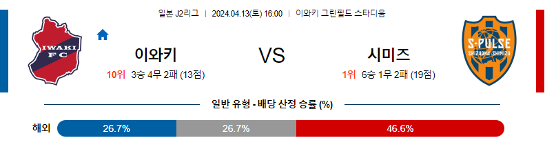 오버(2.5)와 시미즈의 승리를 기대해보는 매치. 호기롭게 이와키가 나서는 상황에서 체급 차이를 극복하지 못했던 것이 크다. 특히 강하게 압박하는 강호들을 상대로 턴오버가 발생하는 상황이 나오면서 수비가 상당히 불안해진다는 점이 이와키의 약점. 시미즈의 체급 상 리그 안에서 시미즈를 상대로 압박 싸움에서 확실한 우위를 기대할 수 있는 팀은 많이 없다.