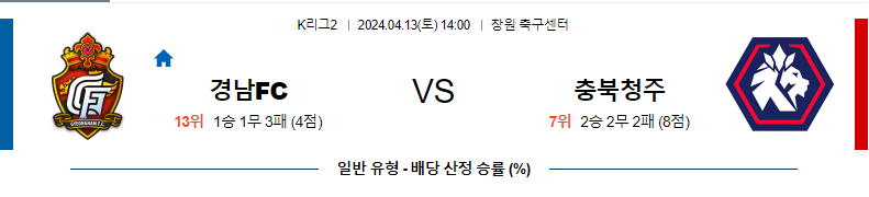 언더(2.5) 양상의 무승부 정도를 생각해보는 매치. 일단 경남의 안정성도 크다고 하기는 어려운 상황이고, 충북 청주가 이 수비적인 리스크를 공략하기에는 공격력이 상당히 부족하다는 생각도 충분히 해야 할 것으로 보이는 매치다. 수비에서는 경남의 주포만 막아내면 되는 상태고, 충북 청주의 수비력도 전반적으로는 폼이 좋은 상태.
