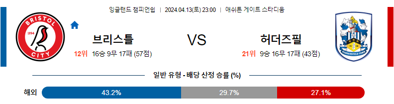 [킹콩티비] 04월 13일 브리스톨 vs 허더즈필드 챔피언쉽 생중계, 스포츠분석,스포츠중계