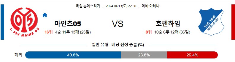 [킹콩티비] 04월 13일 마인츠 vs 호펜하임 분데스리가 생중계, 스포츠분석,스포츠중계