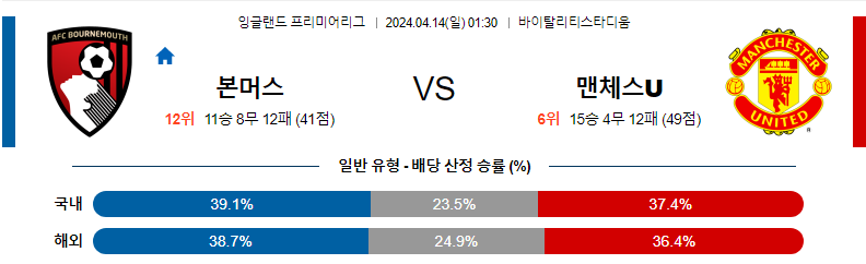 [킹콩티비] 04월 14일 본머스 vs 맨유 EPL 생중계, 스포츠분석,스포츠중계