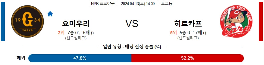 [킹콩티비] 04월 13일 요미우리 vs 히로시마 NPB 생중계, 스포츠분석,스포츠중계