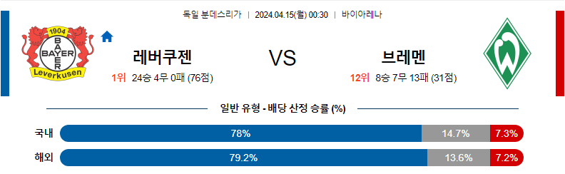 [킹콩티비] 04월 15일 레버쿠젠 vs 브레멘 분데스리가 생중계, 스포츠분석,스포츠중계